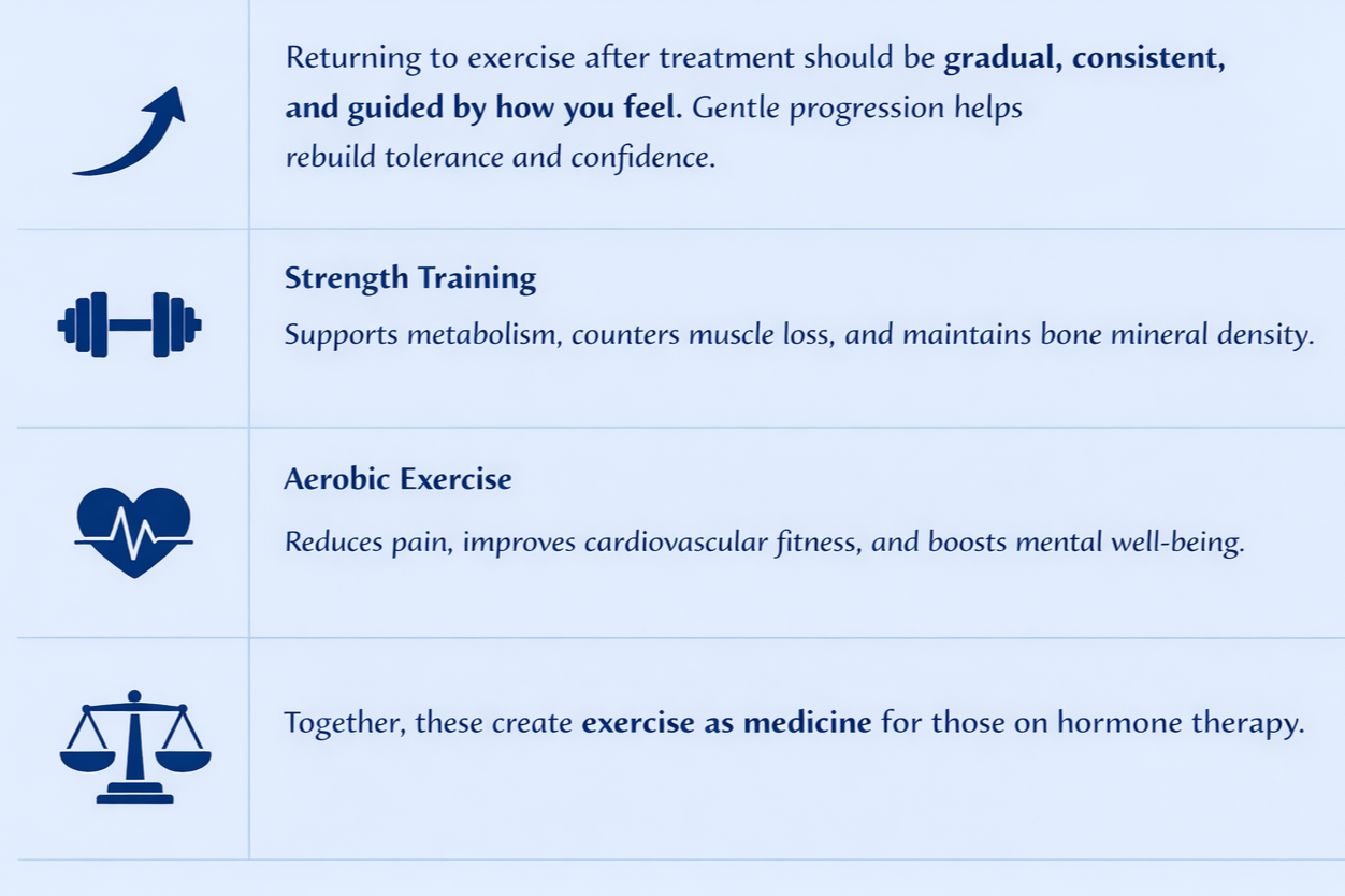 Data supports that greater than 50% of women who take hormone therapy for hormone sensitive breast cancer report side effects. If you are finding yourself overwhelmed with symptoms of hormone therapy such as bone density loss, fatigue or joint pain, this blog will detail how to practice exercise as medicine.