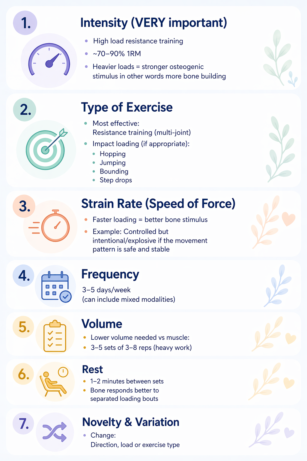 Believe it or not, bone responds differently than muscle— bones need load + impact + novelty! The key Principle is the mechanical loading threshold, this means bone need stress and adapt when strain exceeds habitual levels.
